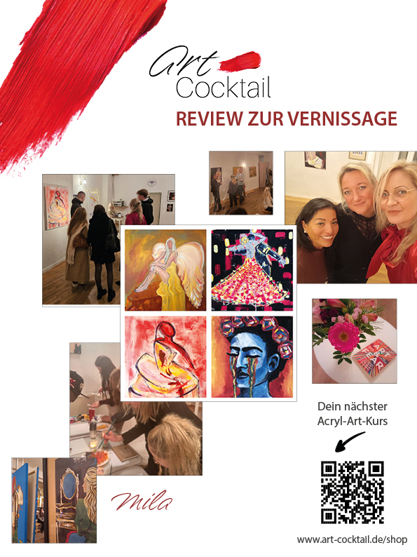 Zur Vernissage – am 06.12.2025 von 16:00 bis 20:00 Uhr im Raum am Ozean, Friedrichstraße 4, Schwerin – präsentiere ich weitere neue Arbeiten und öffne offiziell auch meinen Kursbereich, in welchem du ab dem Tag der Vernissage deine Kunst-Kurse in Schwerin bei Art Cocktail buchen kannst.